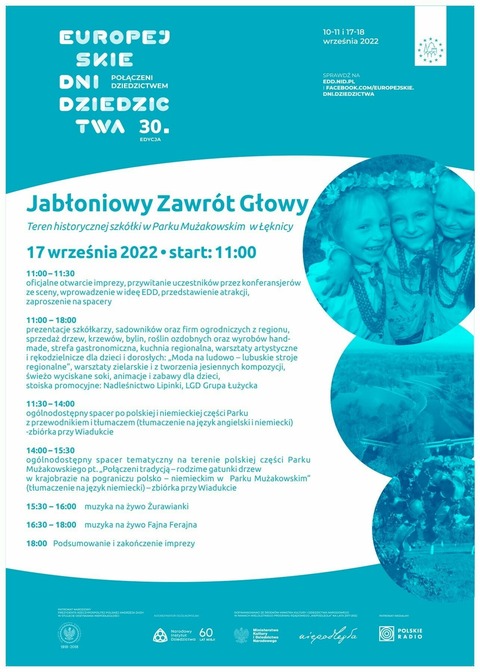 Wir laden Sie am 17. September von 11:00 bis 18:00 Uhr in die Obstbaumschule im Muskau-Park in Łęknica ein - zum Feiertag "Sinnenräume für Apfelbäume". Diese Veranstaltung, die im Rahmen der 30. Ausgabe der Europäischen Tage des Denkmals organisiert wird, findet in Form einer Messe für Pflanzen, Obst und Gemüse statt, kombiniert mit einem Familienpicknick mit einer Spiel- und Animationszone für Kinder. ‎